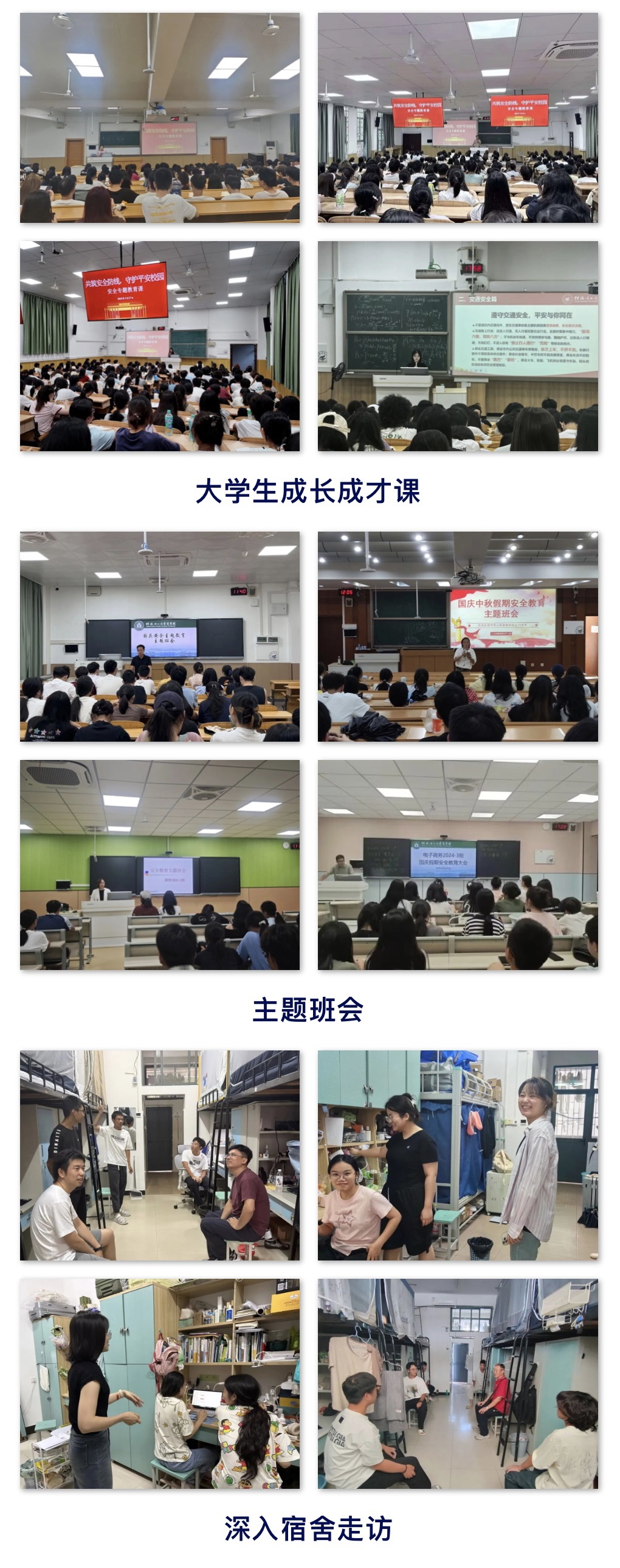 為切實(shí)做好國慶、中秋假期安全穩(wěn)定工作,進(jìn)一步增強(qiáng)學(xué)生安全防范意識(shí),營造安全、文明、和諧的校園環(huán)境,學(xué)院于9月25日—30日,通過多種形式開展安全主題教育,為學(xué)生的假期安全保駕護(hù)航。學(xué)院以大學(xué)生成長(zhǎng)成才課、主題班會(huì)為陣地,重點(diǎn)從假期學(xué)生管理規(guī)定、人身安全、交通安全、財(cái)產(chǎn)安全、出行安全、網(wǎng)絡(luò)安全、宿舍安全、飲食安全、防火防盜、電信詐騙、防溺水等方面進(jìn)行教育,切實(shí)增強(qiáng)學(xué)生安全防范意識(shí)。輔導(dǎo)員、班主任深入宿...