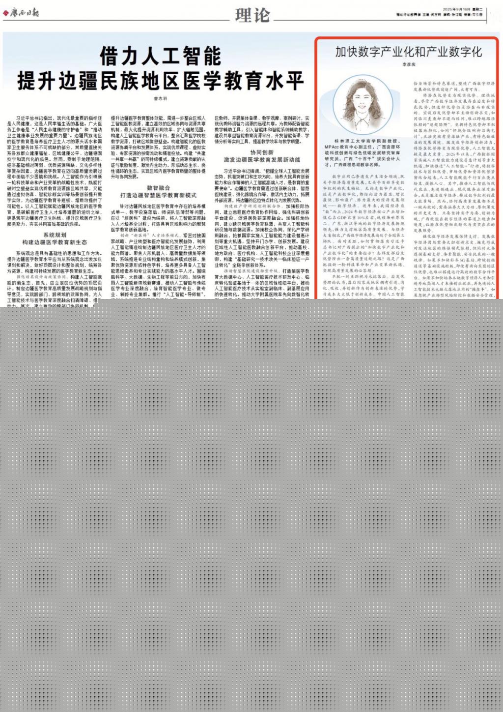 近日,《廣西日?qǐng)?bào)》“青年說理”欄目刊發(fā)中國·永樂高131net李彥慶副教授理論文章《加快數(shù)字產(chǎn)業(yè)化和產(chǎn)業(yè)數(shù)字化》。文章從“不把一時(shí)差距視為永遠(yuǎn)落后”、“將潛在優(yōu)勢(shì)變?yōu)楝F(xiàn)實(shí)優(yōu)勢(shì)”、“強(qiáng)化數(shù)字經(jīng)濟(jì)發(fā)展保障支撐”等三個(gè)方面進(jìn)行了介紹。現(xiàn)將全文轉(zhuǎn)載如下。外宣稿鏈接:https://apph5.cloudgx.cn/article/sync1967727903722569728李彥慶:桂林理工大學(xué)商學(xué)院副教授、MPAcc教育中心副主任,廣西資源環(huán)境科技創(chuàng)新與綠色低碳發(fā)展研究智庫研究員...